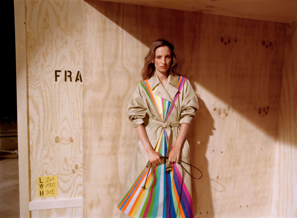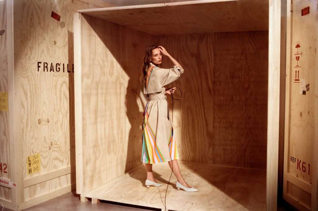 იტალიელი ხელოვანი პაოლა პივი თავის შემოქმედებაში ხშირად იყენებს ყოველდღიურ ნივთებს და მათ მახასიათებლებს ცვლის, რათა აუდიტორიას რეალობის აღქმა გადააფასებინოს. ამჟამად იგი აყვავებულ ჰავაიზე ცხოვრობს და შთაგონებას კუნძულის კაშკაშა სინათლისგან, ფლორისა და ფაუნის ინტენსიური ფერებისა და, რაც მთავარია, იმ ორმაგი ცისარტყელებისგან იღებს, რომლებიც ცაზე თითქმის ყოველდღე ჩნდება. სწორედ ეს ბუნებრივი საოცრებები იქცა ტრენჩის დიზაინის საფუძვლად: მრავალფერი ვერტიკალური ზოლები ლაბადის წინა და უკანა მხარეს მოჰყვება და „ქვიშის საათის“ ფორმას ქმნის, რომელიც წელთან ვიწროვდება.