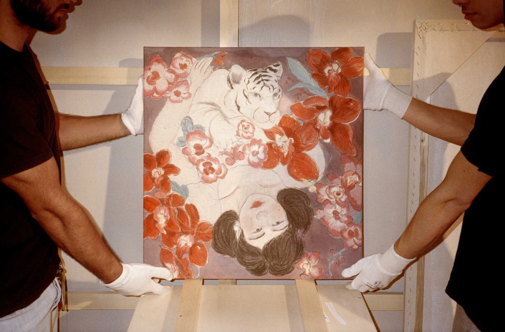ბოლონიაში მოღვაწე ამომავალი ჩინელი ხელოვანი შაფეი სია, რომელიც ცნობილია თავისი მეამბოხე, პროვოკაციული და იუმორისტული ბუნებით, შთაგონებას XIX საუკუნის იაპონური შუნგადან, ჩინური ეროტიკული ფერწერიდან და ლუიჯი ონტანის კულტურული ნარცისიზმიდან იღებს. მან საკუთარი ნამუშევრის შესაქმნელად საფირმო ტექნიკა — სანდალოზის ქაღალდზე აკვარელით ხატვა გამოიყენა: თეთრ ვეფხვთან შერწყმული ქალი, შემკული ყვავილოვანი დეტალებით, რომლებიც ტრენჩის ზურგზე საყელოდან ბოლომდე იშლება. ეს გამოსახულება ქმნის კონტრასტს მშვიდ ზედაპირსა და მის მიღმა არსებულ ქარიშხალს შორის, სადაც ორი ურთიერთსაწინააღმდეგო ძალა თანაარსებობს და ერთმანეთს ერწყმის. სანამ სიცოცხლე სიყვარულსა და ნგრევას შორის იწვის, ჟოლოსფერი ყვავილებიდან სიხარულის ნაპერწკალი ჩუმად მოკრთის.